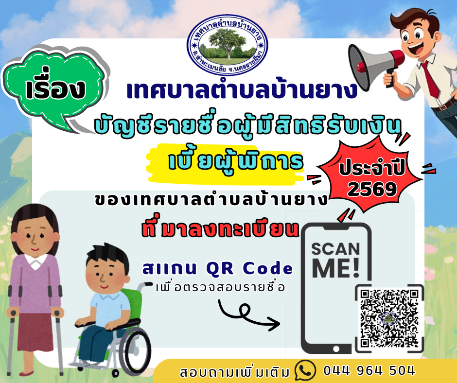 2."ประกาศเทศบาตำบลบ้านยาง เรื่อง บัญชีรายชื่อผู้มีสิทธิรับเงินเบี้ยยังชีพผู้พิการของเทศบาลตำบลบ้านยางประจำปีงบประมาณ พ.ศ.2569 ที่มาลงทะเบียน