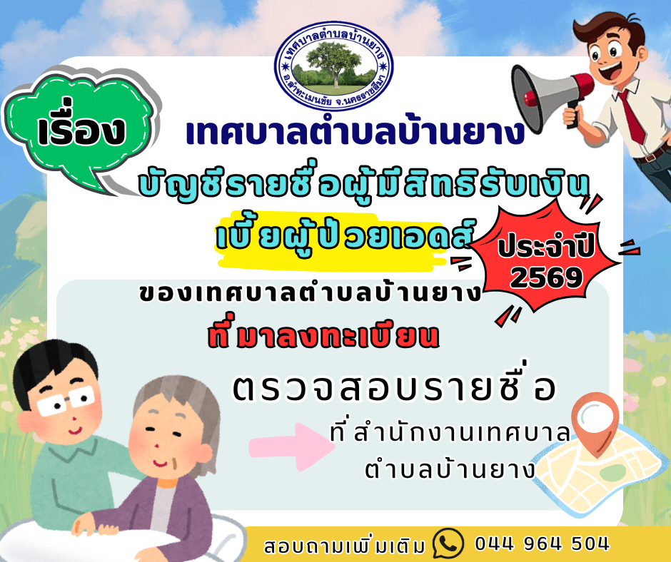 3."ประกาศเทศบาลตำบลบ้านยาง เรื่องบัญชีรายชื่อผู้มีสิทธิรับเบี้ยยังชีพผู้ป่วยเอดส์ของเทศบาลตำบลบ้านยาง ประจำปีงบประมาณ พ.ศ. 2569 ที่มาลงทะเบียน